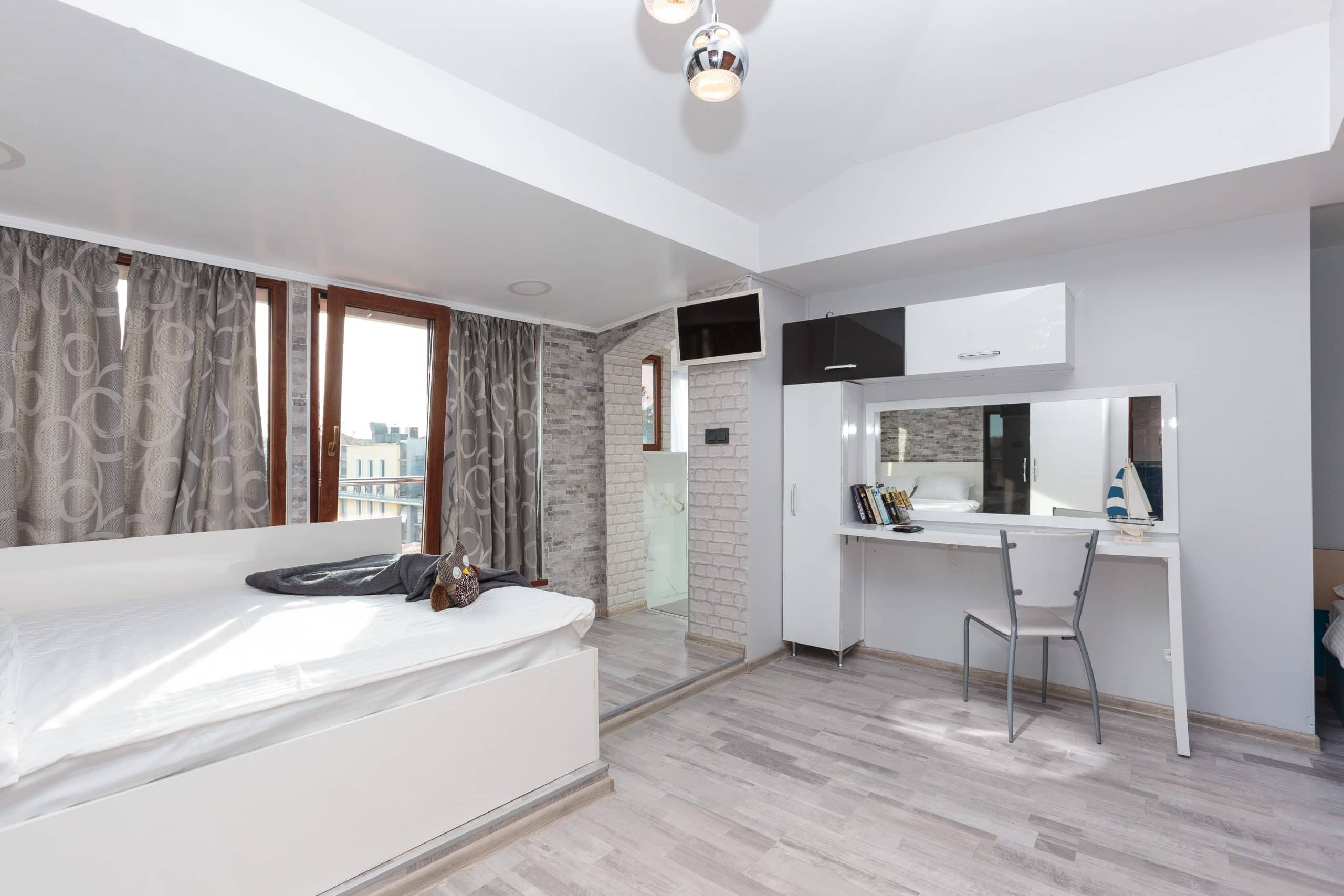 Просторно студио 1 брой на 4-ти етаж с достъп чрез ключ-карта или код. Разполага с две двойни легла, телевизор, работно бюро, гардероб, хладилник, климатик, кана за чай/кафе, баня с душ. Кухненският бокс е добре оборудван. Студиото е подходящо за двама възрасти и едно дете до 12 г. или 3 възрастни.