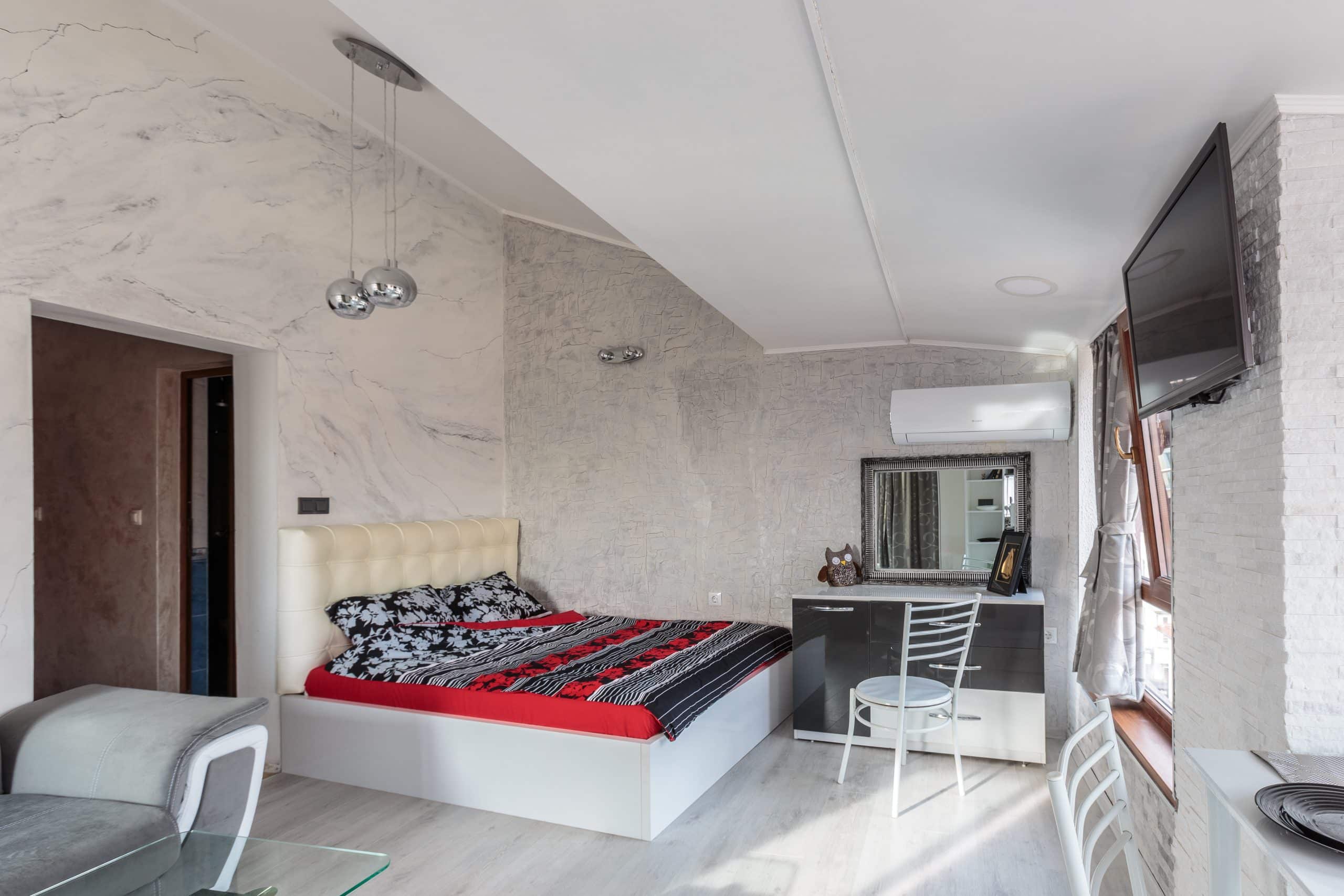 Фамилното студио с кухня и тераса е предназначено за 3 възрастни или 2 възрастни и дете до 12-годишна възраст. Достъпът е чрез ключ-карта или персонален код. Сред осигурените удобства са двойно легло, разтегателен диван, телевизор, гардероб, хладилник, климатик, кана за чай и кафе. Банята е с душ, а в кухненския бокс има фурна, котлони, микровълнова печка, кафе машина и посуда. Студиото е разположено на четвъртия етаж. Има и тераса.